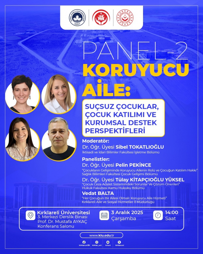 Üniversitemiz ile Kırklareli Aile ve Sosyal Hizmetler İl Müdürlüğü iş birliğiyle, 2025 Aile Yılı etkinlikleri kapsamında “Koruyucu Aile: Suçsuz Çocuklar, Çocuk Katılımı ve Kurumsal Destek Perspektifleri” başlıklı panel gerçekleştirilecektir. Panel, 3 Aralık 2025 Çarşamba günü saat 14.00’te, Kırklareli Üniversitesi 3. Merkezi Derslik Binası Prof. Dr. Mustafa Aykaç Konferans Salonu’nda yapılacak, panelin moderatörlüğünü Merkez Müdürümüz Dr. Öğr. Üyesi Sibel Tokatlıoğlu üstlenecektir. Panele tüm üniversite personeli ve öğrencilerimiz davetlidir.