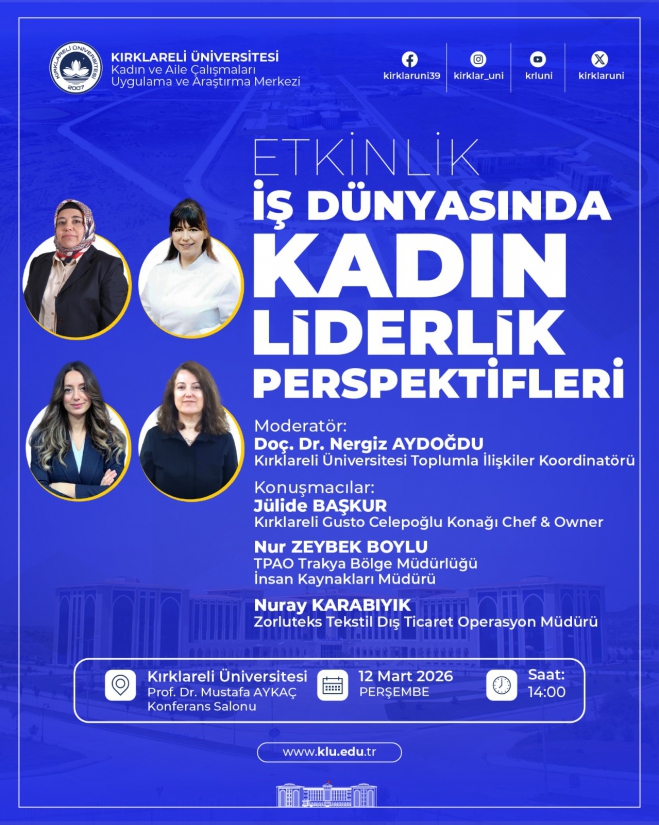 Kadın ve Aile Çalışmaları Uygulama ve Araştırma Merkezimizin 8 Mart Dünya Emekçi Kadınlar Günü kapsamında organize ettiği “İş Dünyasında Kadın Liderlik Perspektifleri” Paneli, 12 Mart 2026 Perşembe günü saat 14.00’te Kayalı Kampüsü 3. Merkezi Derslik Prof. Dr. Mustafa Aykaç Konferans Salonunda gerçekleşecektir. Panele tüm üniversite personeli ve öğrencilerimiz davetlidir.