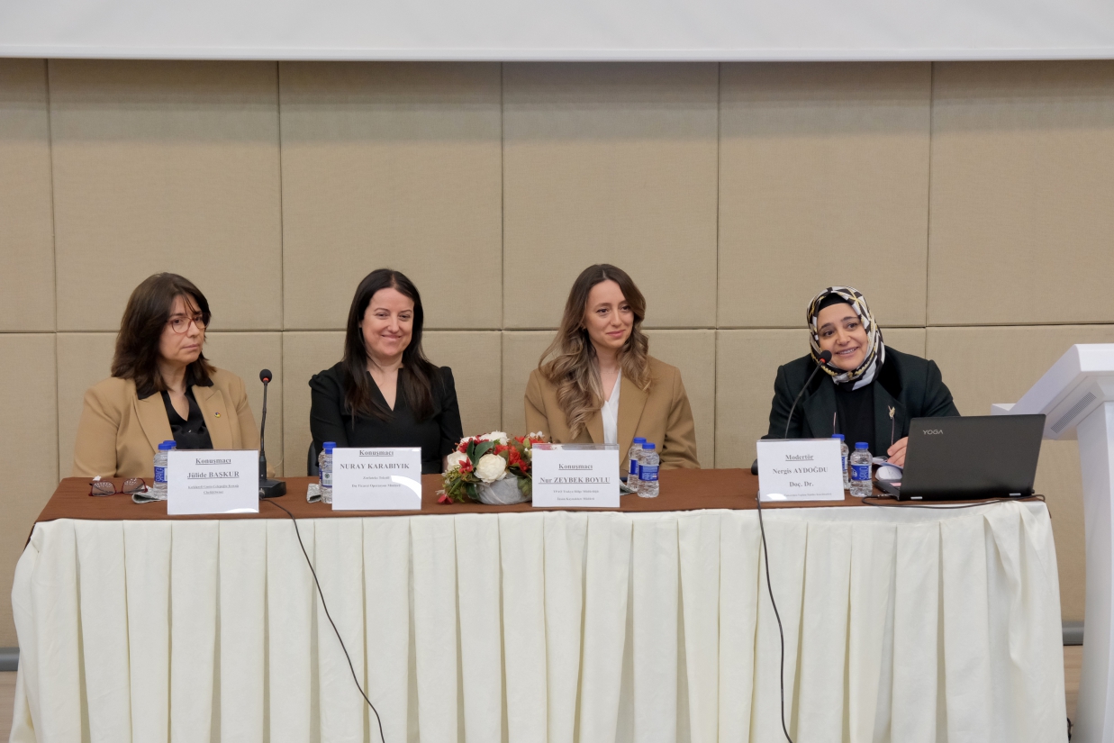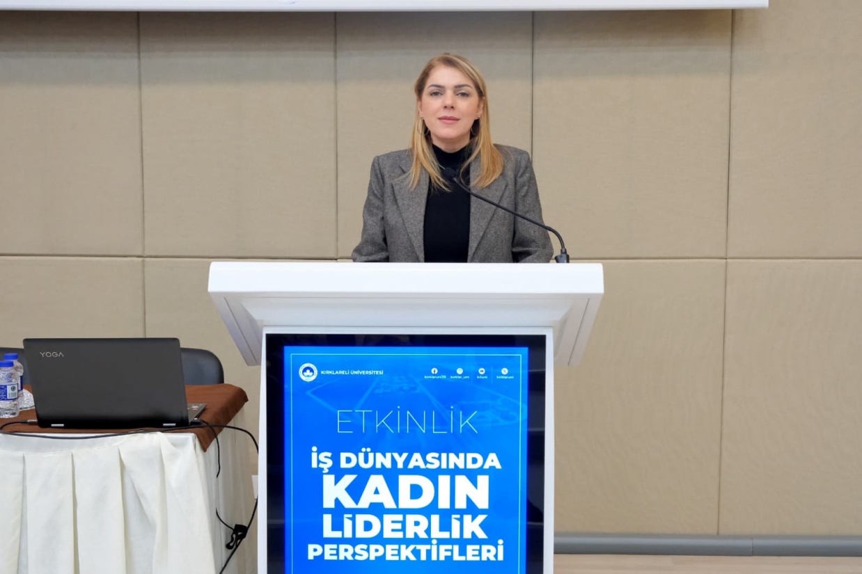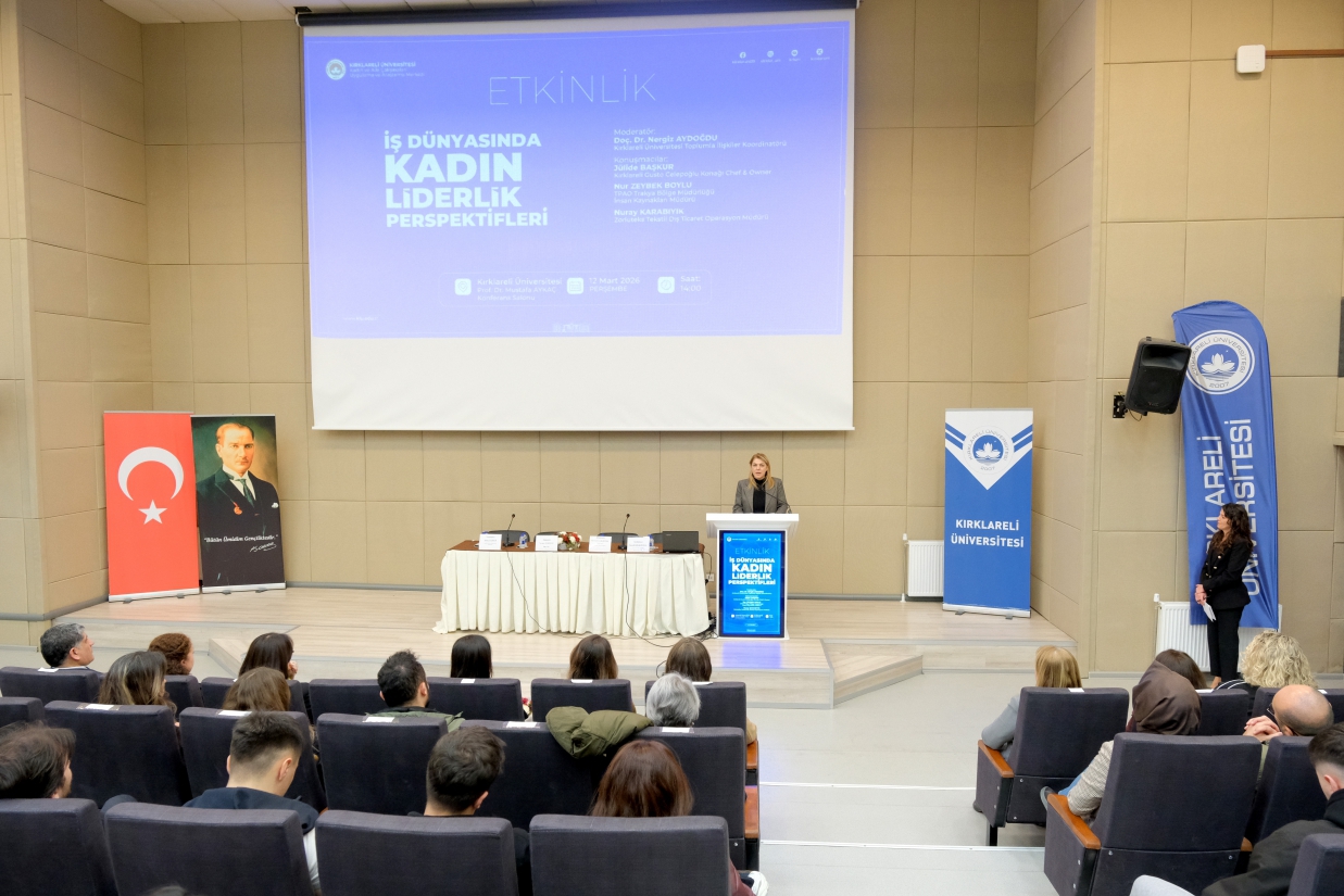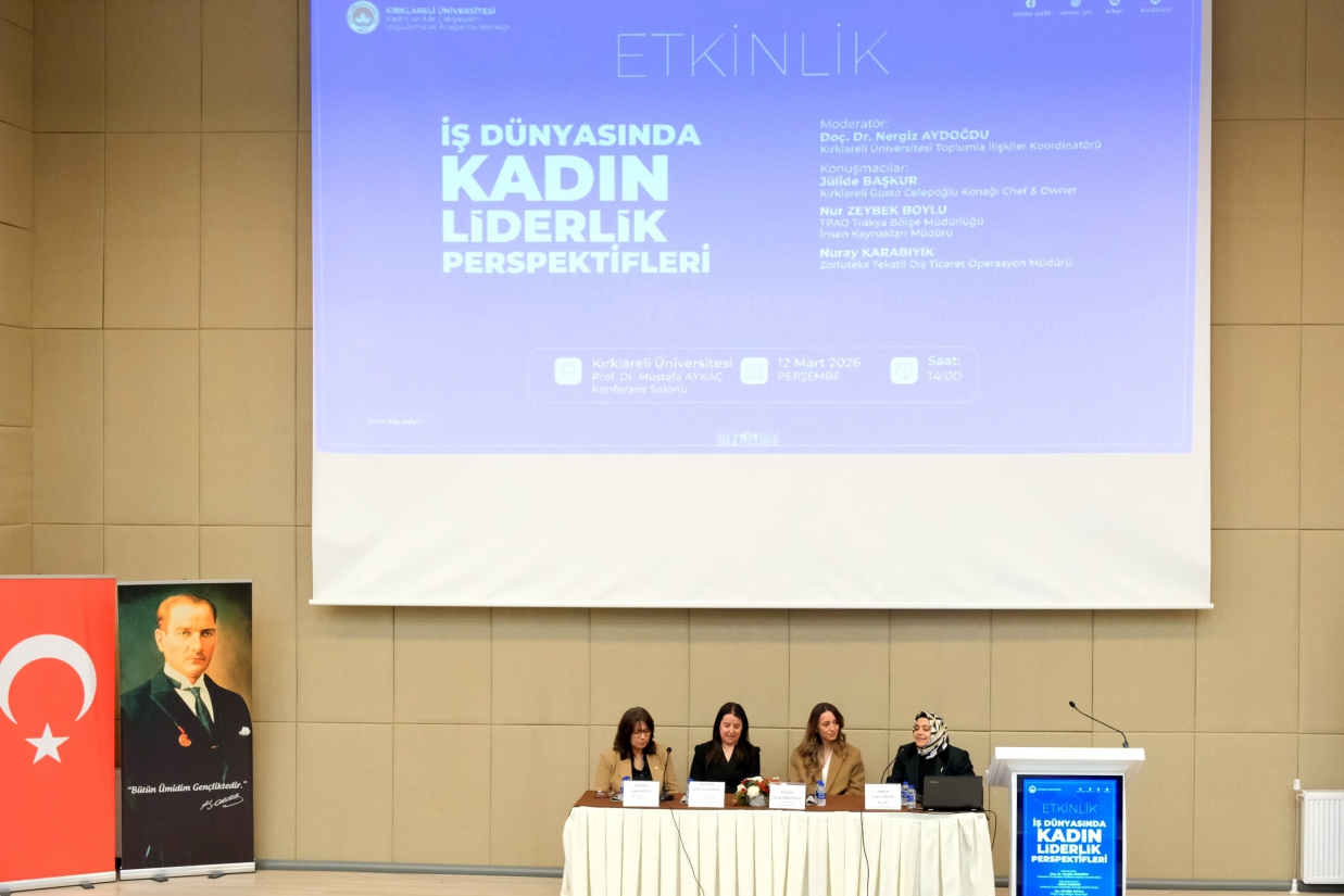 Merkezimiz tarafından 8 Mart Dünya Emekçi Kadınlar Günü kapsamında düzenlenen "İş Dünyasında Kadın Liderlik Perspektifleri" Paneli, 12 Mart 2026 Perşembe günü Rektörümüz Prof. Dr. Rengin Ak, Rektör Yardımcılarımız Prof. Dr. Eylem Özkaya Lassalle ve Prof. Dr. Meryem Çamur Demir ile Uluslararası İlişkiler Koordinatörü Prof. Dr. Berna Ak Bingül'ün katılımıyla gerçekleştirildi. Merkez Müdürü Dr. Öğr. Üyesi Sibel Tokatlıoğlu'nun açılış konuşması ve Rektörümüz Prof. Dr. Rengin Ak'ın konuşmasıyla başlayan, Merkez Yönetim Kurulu Üyesi ve Toplumla İlişkiler Koordinatörü Doç. Dr. Nergiz Aydoğdu'nun moderatörlüğünü üstlendiği panele; Kırklareli Gusto Celepoğlu Konağı Şefi ve Sahibi Jülide Başkur, Türkiye Petrolleri Anonim Ortaklığı Trakya Bölge Müdürlüğü İnsan Kaynakları Müdürü Nur Zeybek Boylu ve Zorluteks Tekstil Dış Ticaret Operasyon Müdürü Nuray Karabıyık konuşmacı olarak katıldı. Konuşmacılar, iş dünyasındaki kariyer yolculuklarını ve liderlik deneyimlerini paylaştı; öğrencilerimize kariyer ve yaşam tercihlerine ilişkin birikimlerinden süzülen önerilerde bulundu. Panel, teşekkür belgelerinin takdim edilmesiyle son buldu.